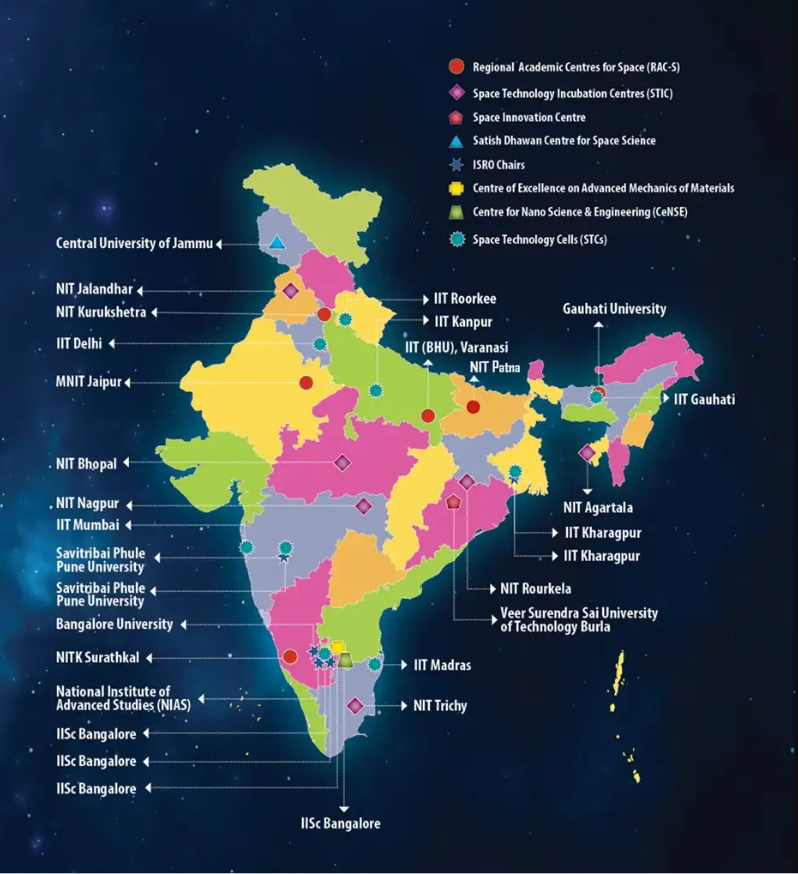 - ISRO cells: ISRO also established cells at various premier engineering institutions for carrying out Joint research. Space Technology Cells (STC) are instituted at IITs’ and IISc for advanced research with the respective institution. Space Technology Innovation Centre(STIC) at NITs in various regions to focus on entrepreneurial oriented projects and Regional Academia Centres for Space (RAC-S) are instituted at NITs in the different regions to encourage the collaborative projects in space in that region. In additional various centre of excellences, Innovation centres and space science centres are also instituted to promote the research in space.